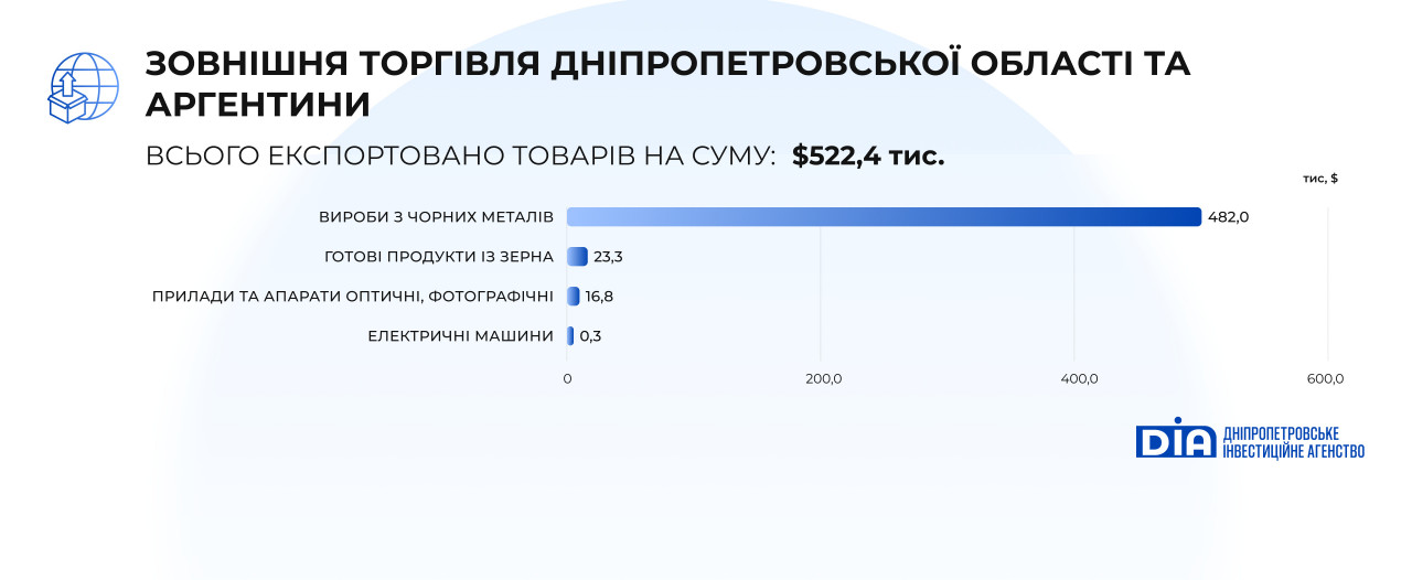 Аргентина залишається важливим торговельним партнером Дніпропетровської області. Про рівень партнерських відносин свідчить двосторонній аналіз зовнішньої діяльності. Аргентинськи підприємства зацікавлені у виробах з чорних металів, готових продуктах із зерна, приладах та апаратах оптичних, фотографічних. Обсяг експорту товарів з Дніпропетровської області складав $0,5 млн та збільшився у порівнянні з 2023 роком у 18,8 раз.