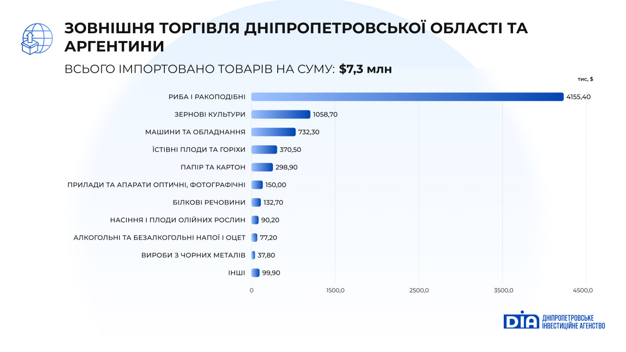 Своєю чергою близько 40 підприємств імпортерів регіону найбільше купували аргентинські товари, а саме: рибу та ракоподібних, зернові культури, машини та обладнання, їстівні плоди та горіхи, папір та картон, інше. Імпорт товарів з Аргентини в Дніпропетровську область збільшився на 67,7% та складав $7,3 млн.