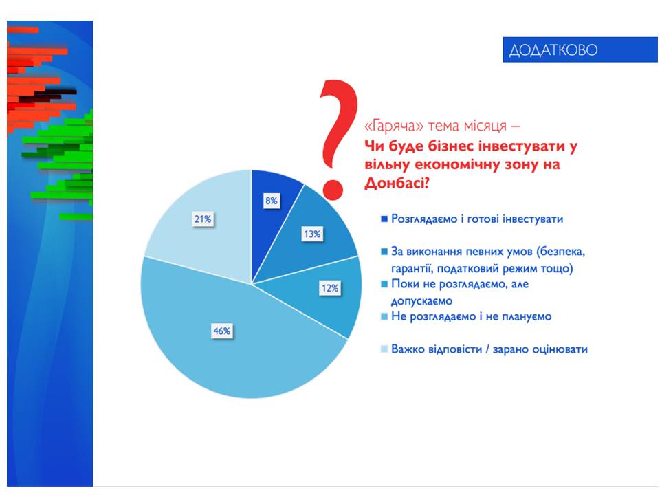 Результати опитування щодо готовності бізнесу інвестувати у потенційну вільну економічну зону на Донбасі свідчать, що відносна більшість підприємців (46%) поки не розглядають таку можливість і не мають відповідних планів. Ще 12% поки не розглядають, але допускають таку можливість. Лише 8% розглядають таку можливість і готові інвестувати і ще 13% – за виконання певних умов (безпека, гарантії, пільговий податковий режим, тощо). Майже 20%  респондентів вважає, що важко відповісти на це питання і зарано робити оцінки щодо доцільності інвестування.