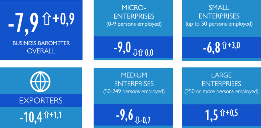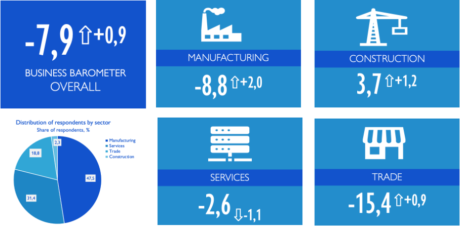In November 2025, the overall Business Barometer Index increased to –7.9 ⇧+0.9, remaining in the zone of negative expectations.