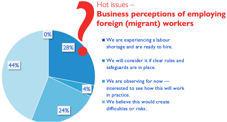Survey results on business attitudes toward hiring foreign (migrant) workers show that most entrepreneurs do not support this idea, preferring Ukrainian staff (44%) or believing that hiring migrants would create additional difficulties or risks (24%). Only 28% are willing to consider this possibility if clear rules and safeguards are in place, 4% prefer to observe how this works in practice, and none of the respondents reported a labour shortage severe enough to hire migrants without additional conditions.