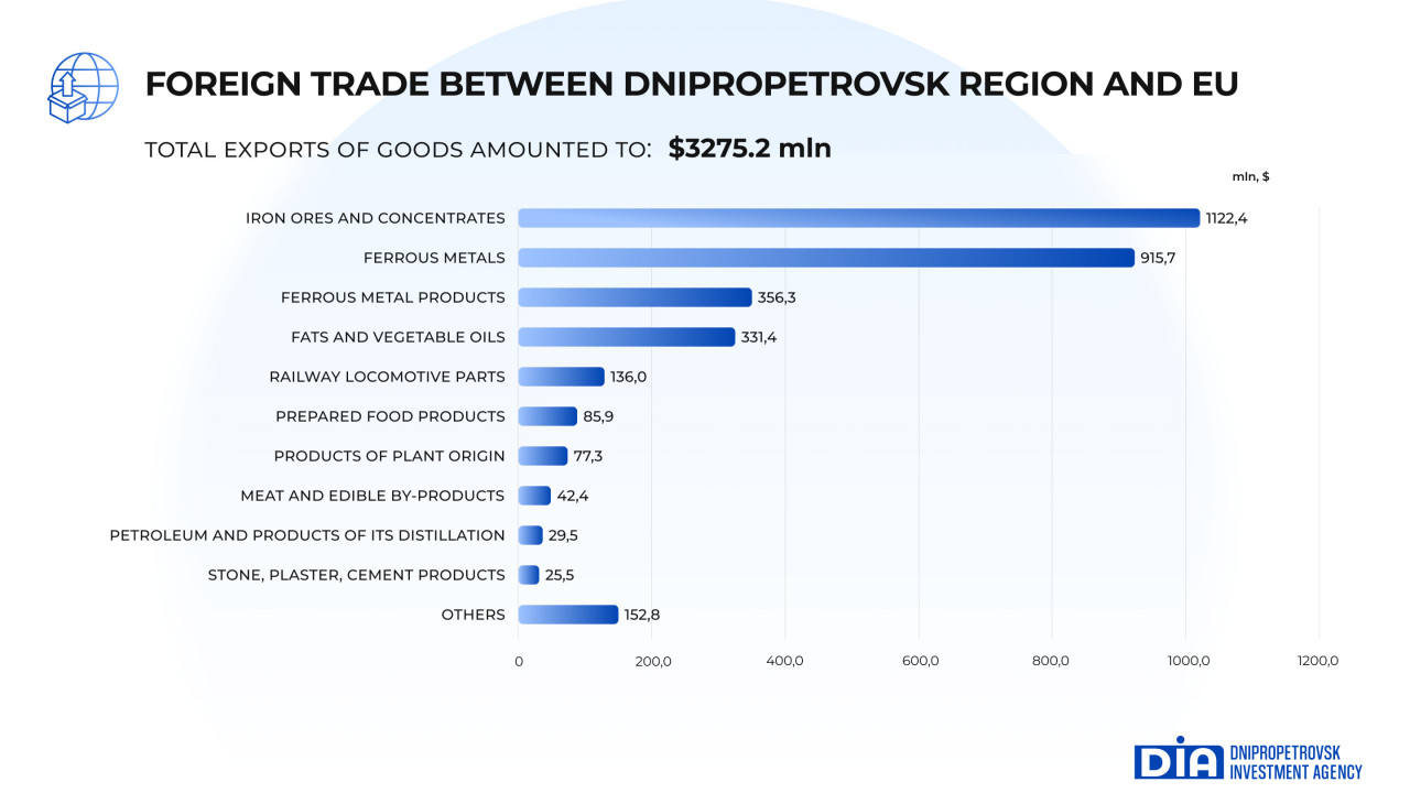 According to the results of 2024, the volume of exports of goods from Dnipropetrovsk region decreased by 4.2%, amounting to $3,275.2 million. Among the goods that are in the highest demand among European consumers are ores, slags, ferrous metals and products thereof, products of plant origin, fats and vegetable oils and others.