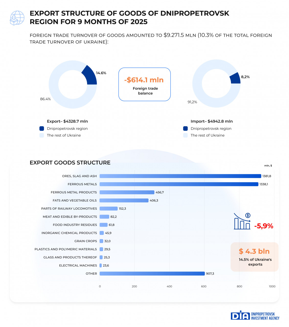 Dnipropetrovsk Investment Agency keeps introducing about the results of foreign trade operations with goods in Dnipropetrovsk region for 9 months of 2025.