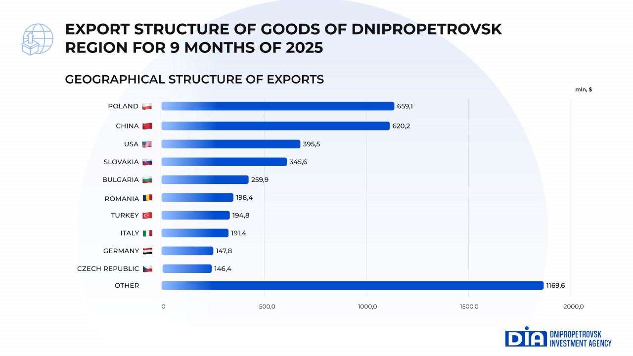 According to the results of the nine months of 2025, enterprises in Dnipropetrovsk region reduced their exports by 5.9%, supplying products worth $4,328.7 million to foreign markets, which corresponds to 14.6% of total Ukrainian exports. Despite the overall decline, the region remains a leader in Ukranian exports, particularly in the ferrous metallurgy, iron ore, land transport equipment and certain types of agricultural products, including vegetable oils and fats.
