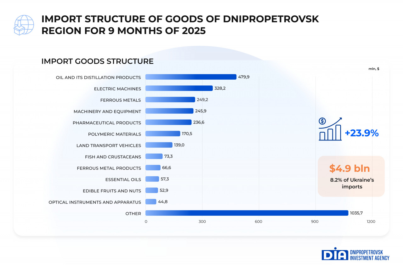 In the nine months of 2025, the volume of goods imported into Dnipropetrovsk region increased by 23.9% and reached $4,942.8 million, which is 8.2% of total Ukrainian imports. This significant growth is due to the gradual recovery of economic activity in the region, in particular: