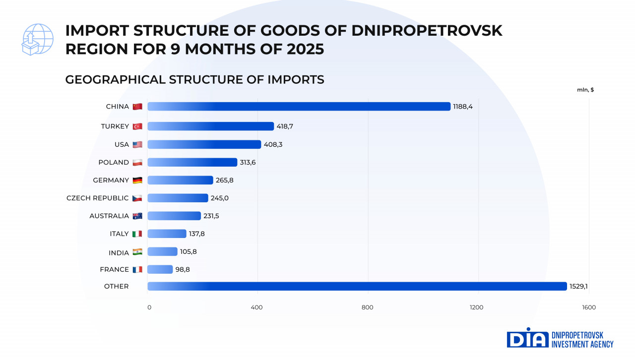 Among the countries whose products are most in demand in Dnipropetrovsk region, China leads with positive dynamics (an increase of 25.2%) with a volume of $1,188.4 million. Turkey is in second place, with imports of goods increasing by 2.6% to $418.7 million. The United States is in third place. Imports amounted to $408.3 million and increased by 89.2% compared to the same period in 2024.
