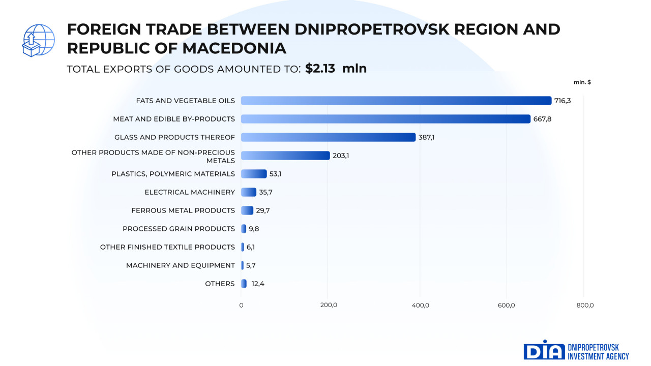 13 enterprises in Dnipropetrovsk region exported their products to the Macedonian market, including metallurgical, processing and mechanical engineering companies.