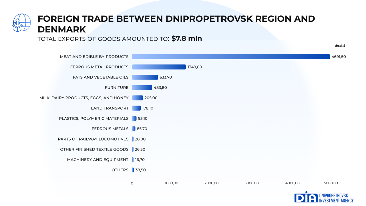 Denmark remains an important trading partner for Dnipropetrovsk region. A bilateral analysis of foreign trade activity attests to the high level of these partnership relations. Danish companies are most interested in meat and edible meat by-products, ferrous metals and products made from them, fats and vegetable oils, furniture, land transport vehicles, and other goods. According to the results for the first nine months of 2025, the volume of goods exported from Dnipropetrovsk region amounted to $7.8 million, accounting for 5.2% of Ukraine’s total exports to Denmark.
