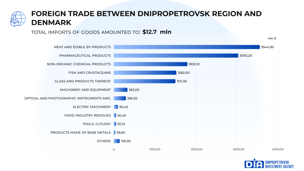 Imports of goods from Denmark to Dnipropetrovsk region increased by 2 times compared to the first nine months of 2024, totaling $12.7 million.