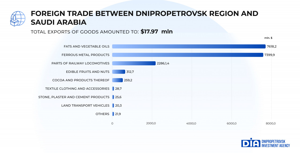More than 20 enterprises in Dnipropetrovsk region exported their products to the Saudi market, including metallurgical, food, agricultural, and mechanical engineering companies.