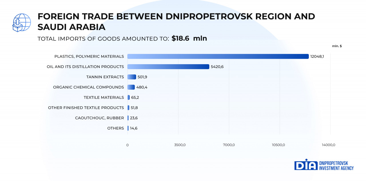 Dnipropetrovsk Investment Agency keeps introducing about the level of Ukraine and Dnipropetrovsk region cooperation with other countries amid the unprovoked military aggression by the russian federation. For now, we propose an overview of the assistance provided by Saudi Arabia and the foreign trade volume figures, which is derived from DIABASE data.