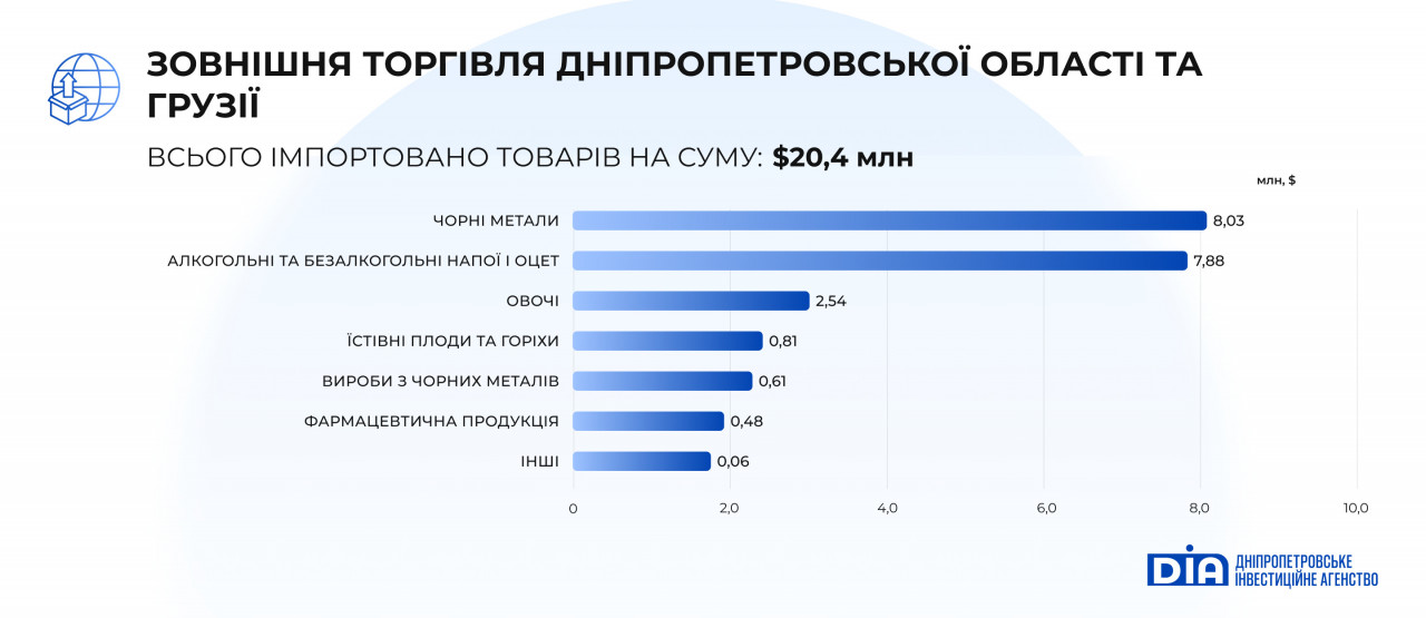 Обсяг експорту товарів з Дніпропетровської області збільшився у порівнянні з 2023 роком на 4,5% та складав $19,5 млн, а це 8% від обсягу показника України. Грузинськи підприємства зацікавлені у продуктах переробки овочів, виробах з чорних металів, харчових продуктах з м’яса та риби, пластмасах та полімерних матеріалах.