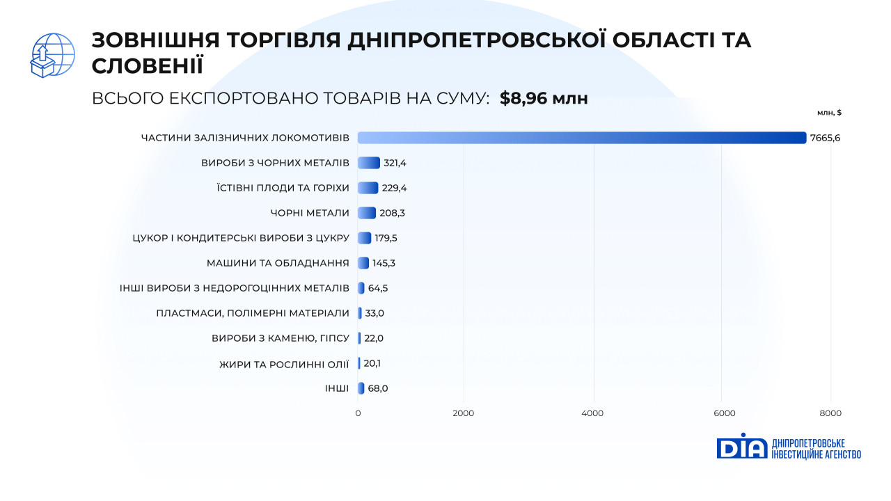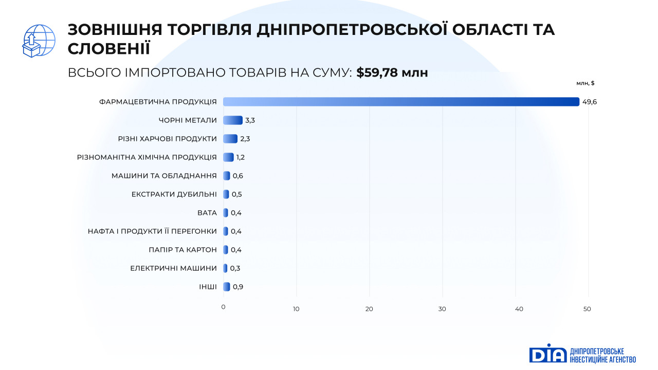 Дніпропетровська область залишається ключовим споживачем словенських товарів в Україні: на її частку припадає понад 22% імпорту зі Словенії. У 2024 році обсяг поставок склав $59,8 млн, що на 7,3% нижче, ніж роком раніше. Дніпропетровщина традиційно купувала: фармацевтичну продукцію, чорні метали, харчові продукти, різноманітну хімічну продукцію, машини та обладнання, інше.