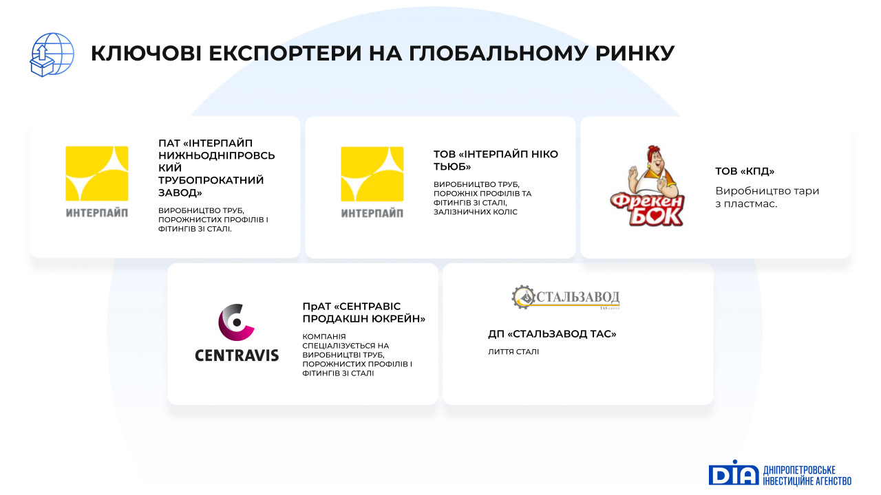 Експортні операції здійснювали 20 підприємств з Дніпропетровської області. Основні компанії експортери – це підприємства металургійного комплексу, переробної промисловості та машинобудівні підприємства.