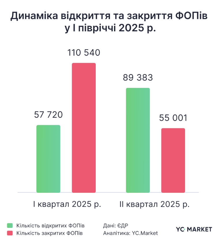 «Ефект відкладеного попиту», спричиненого масштабною кібератакою на держреєстри на початку року, згас. Кількість закриттів повернулася до норми, скоротившись майже на 50% до 55 тисяч. Одночасно з цим суттєво пожвавилася ділова активність: у квітні-червні було зареєстровано майже 89,4 тис. нових ФОПів, що на 55% більше, ніж на початку року.