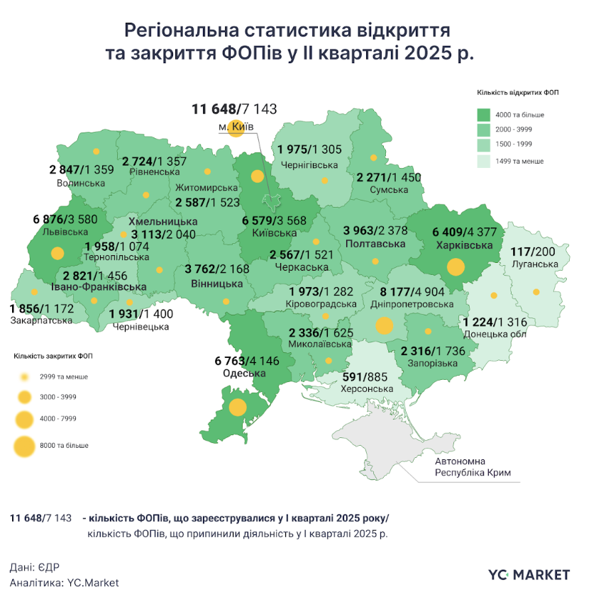 Щодо закриття бізнесів, то картина теж покращилася в усіх регіонах. Київ залишається на першому місці за абсолютною кількістю закритих ФОПів, проте столиця тепер має позитивний баланс: нових бізнесів відкрилося майже на 4,5 тис. більше, ніж закрилося.