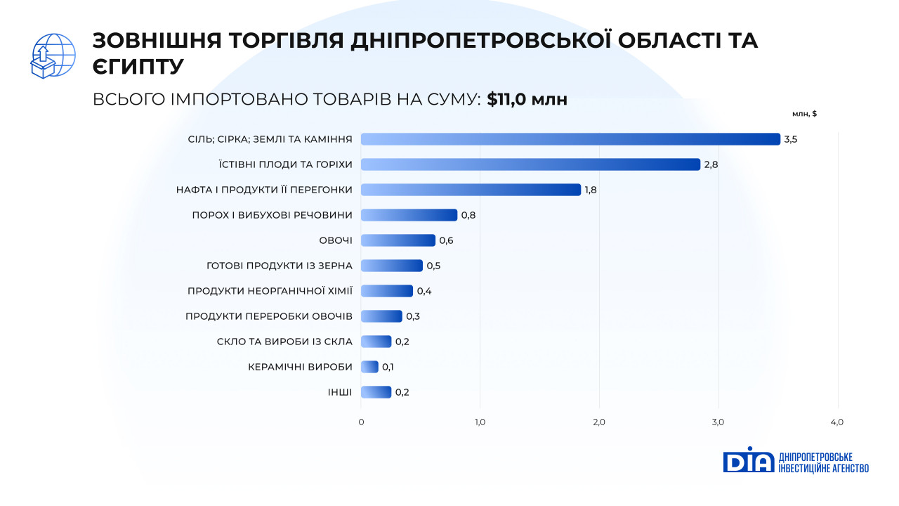 Своєю чергою 42 підприємства імпортера регіону найбільше купували єгипетські товари, а саме: сірку, сіль, їстівні плоди та горіхи, нафту і продукти її перегонки, порох і вибухові речовини інше. Імпорт товарів з Єгипту в Дніпропетровську область збільшився на 23,6% та складав $11,0 млн.