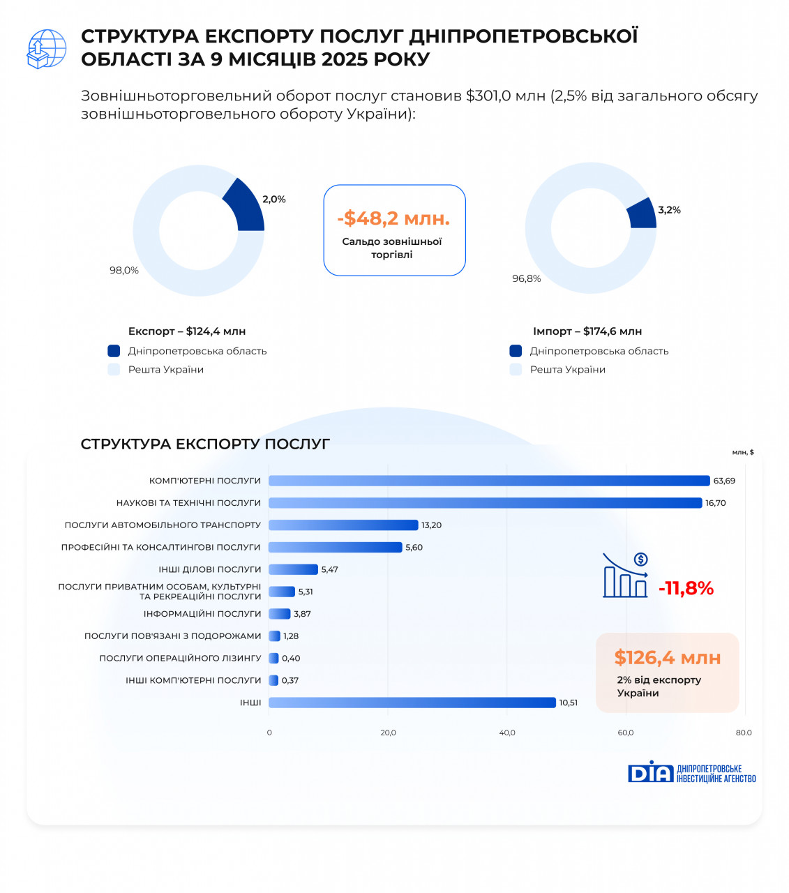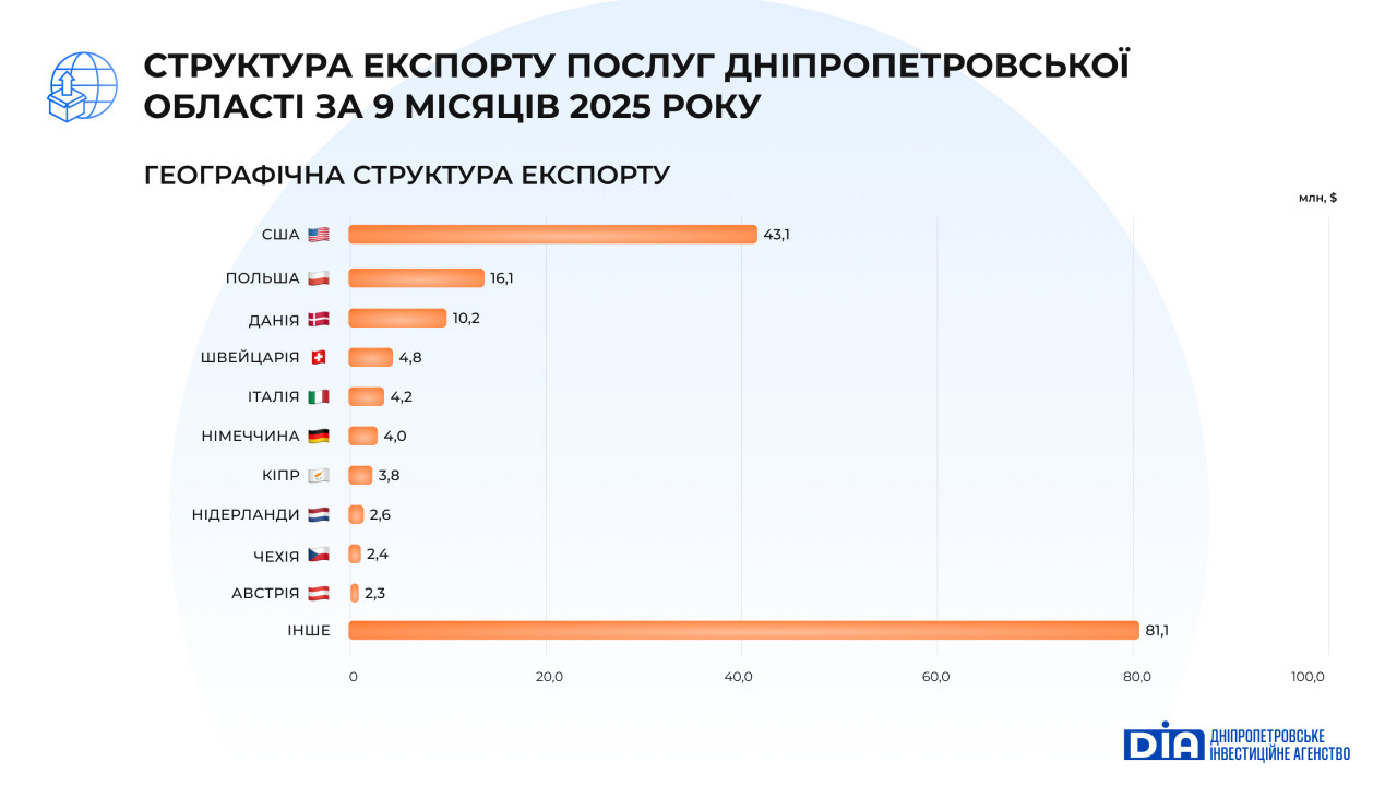 Експорт послуг з Дніпропетровської області за січень–вересень 2025 року становив $126,4 млн (2% загальноукраїнського показника), що на 11,8% менше, ніж торік. Найбільшу частку експорту формує сектор ІТ – $63,7 млн (50,4% від загального обсягу експорту послуг). Незначне скорочення IT-експорту (-1,4%) пов’язане з частковою релокацією компаній за кордон, конкуренцією за контракти та загальним сповільненням глобального попиту на ІТ-послуги.