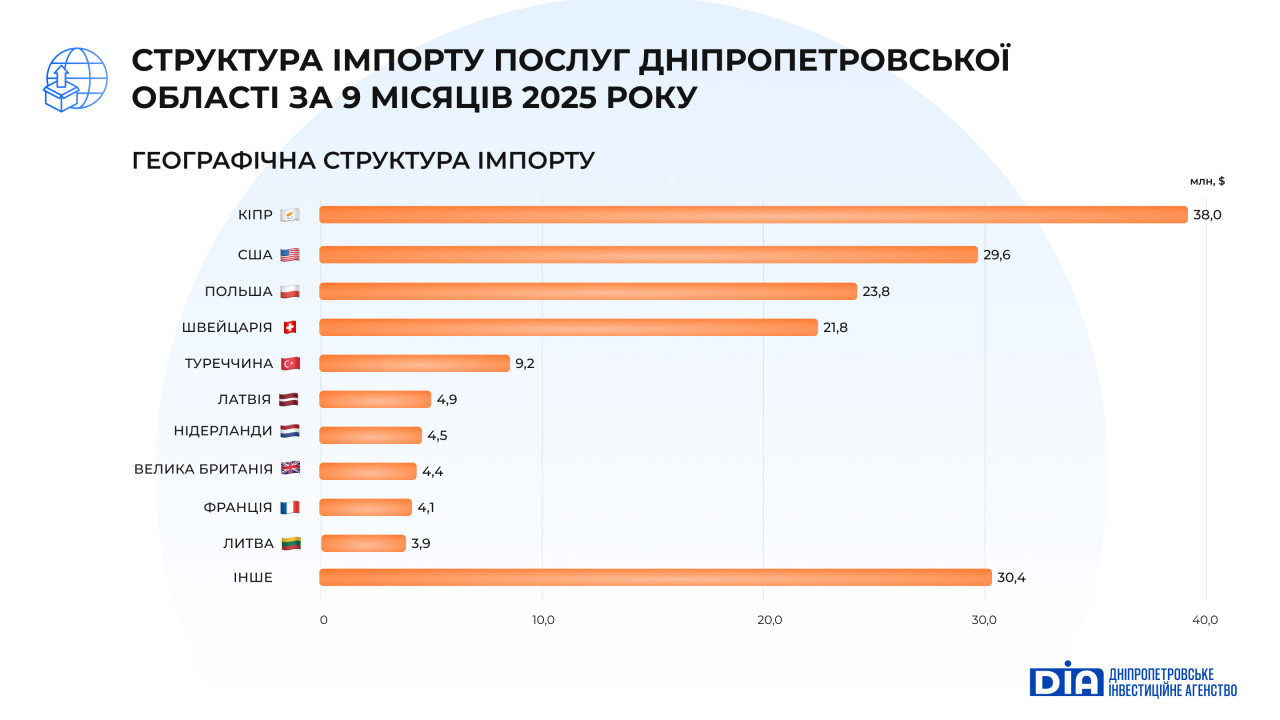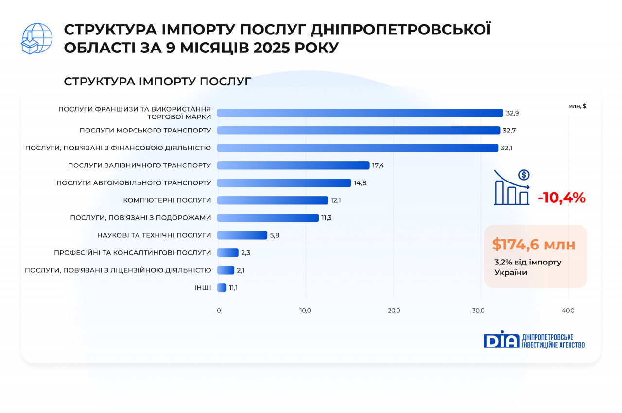 Імпорт послуг до Дніпропетровської області за 9 місяців 2025 року становив $174,6 млн (3,2% загальноукраїнського імпорту) та зменшився на 10,6% у порівнянні з відповідним періодом 2024 року. Скорочення відбулося переважно через зниження активності у секторах, що традиційно орієнтовані на імпортовані спеціалізовані послуги, а також через оптимізацію витрат бізнесу в умовах війни.