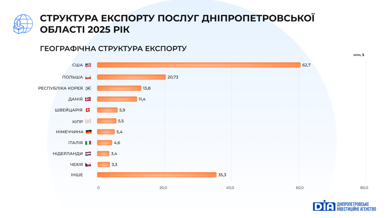 Експорт послуг з Дніпропетровської області за 2025 рік становив $172,0 млн (близько 2% загальноукраїнського показника). Найбільшу частку експорту формує ІТ ‒ $85,1 млн (49,5% від загального обсягу експорту послуг). Незначне зростання ІТ-експорту (+0,4%) можна пояснити відносною стійкістю галузі до фізичних обмежень: послуги надаються дистанційно, з гнучким залученням команд у різних локаціях; частина компаній змогла утримати контракти завдяки, резервним каналам енергоживлення та переорієнтації на довгострокові клієнтські проєкти, а також завдяки попиту на кібербезпеку й автоматизацію процесів у міжнародних компаніях.