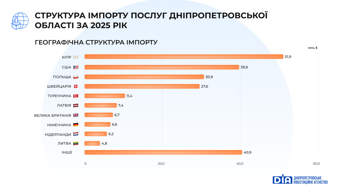 Імпорт послуг до Дніпропетровської області за 2025 рік становив $234,3 млн (3,1% загальноукраїнського імпорту) та зменшився на 10,8% порівняно з 2024 роком. Скорочення відбулося переважно через згортання або перенесення інвестиційних і консалтингових проєктів, оптимізацію витрат бізнесу на зовнішніх підрядників, а також через падіння обсягів виробництва, що автоматично зменшило попит на частину супутніх сервісів (логістика, супровід контрактів, інжиніринг, маркетингові та професійні послуги). Головним чинником є локалізація послуг, а саме перехід на українських постачальників.